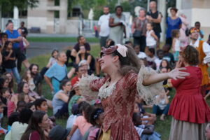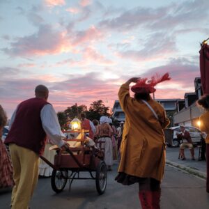 Spectacle visuel et théâtral en déambulation, jeu avec le public, chants, jonglage, costumes colorés : un moment suspendu dans le temps, une fresque vivante en hommage à Molière et au théâtre itinérant.