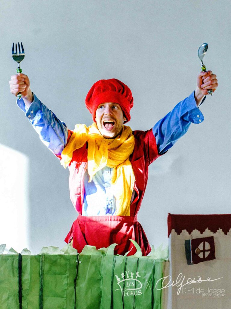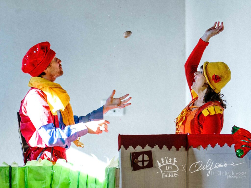 Marionnettes, comptines pendant environ 40 minutes. Bouchon et Pelote veulent faire la cuisine, mais tout disparaît au fur et à mesure. Qui sont les coquins qui se servent ainsi ?