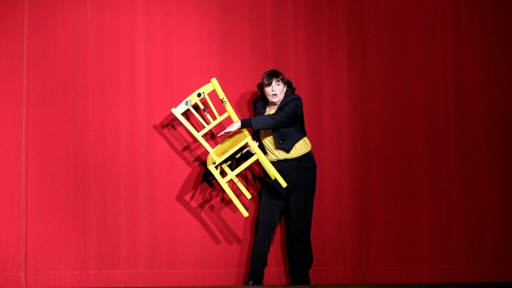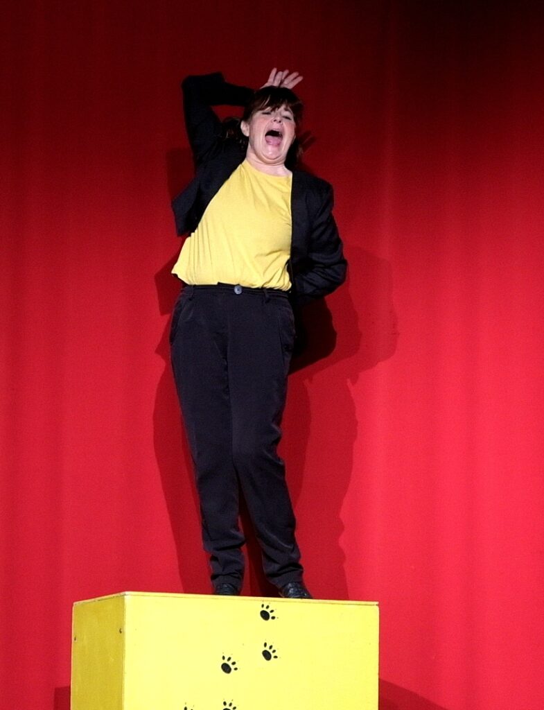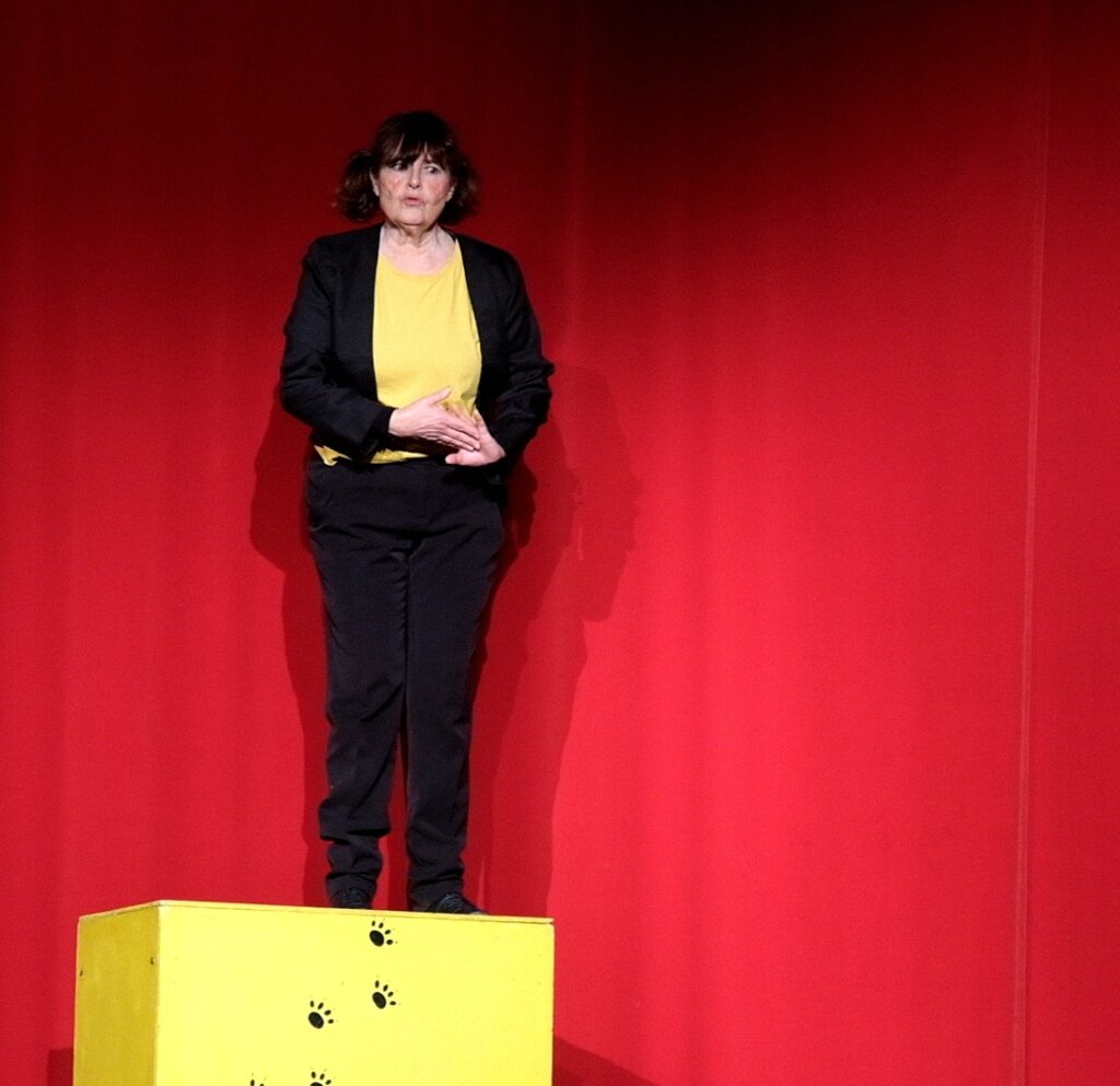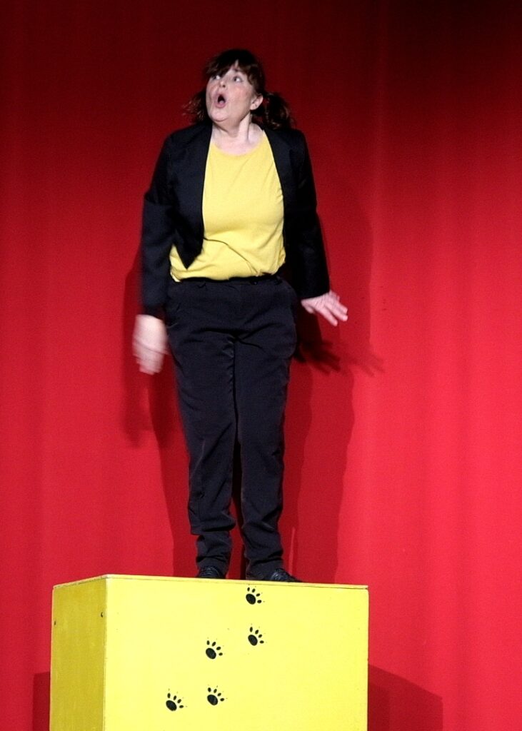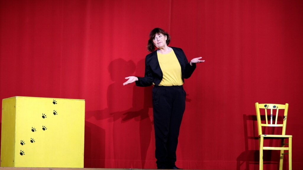 Le conte est dit dans son intégralité. Une chaise et un promontoire en bois sont les seuls éléments de décor. Des traces de pattes de chat, noires sur fond jaune, tout est fait pour favoriser la concentration sur la tenue du corps et la voix. Le spectacle dure ¾ d’heure et s’adresse plutôt aux enfants à partir de 6 ans.