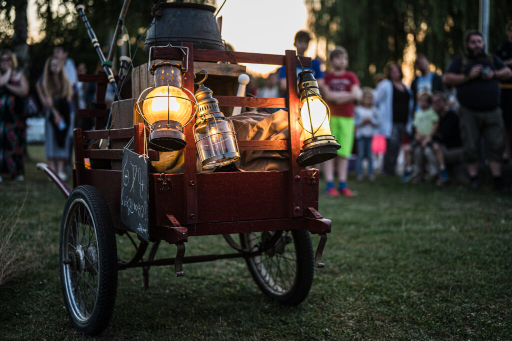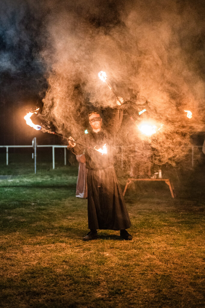 Jeu avec le public, théâtre, déambulations, chants, musique, percussions, effets visuels et final enflammé !