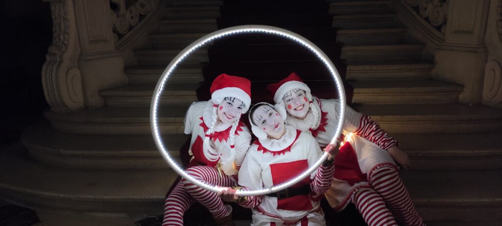 Un lutin du Père Noël est toujours joyeux : il court, il saute, il jongle, il marche sur les mains, danse avec des cerceaux, et autres facéties ! Autant de talents qui sont régulièrement présents dans le spectacle grâce à Camille Roquencourt, artiste de cirque. Présence selon disponibilités.