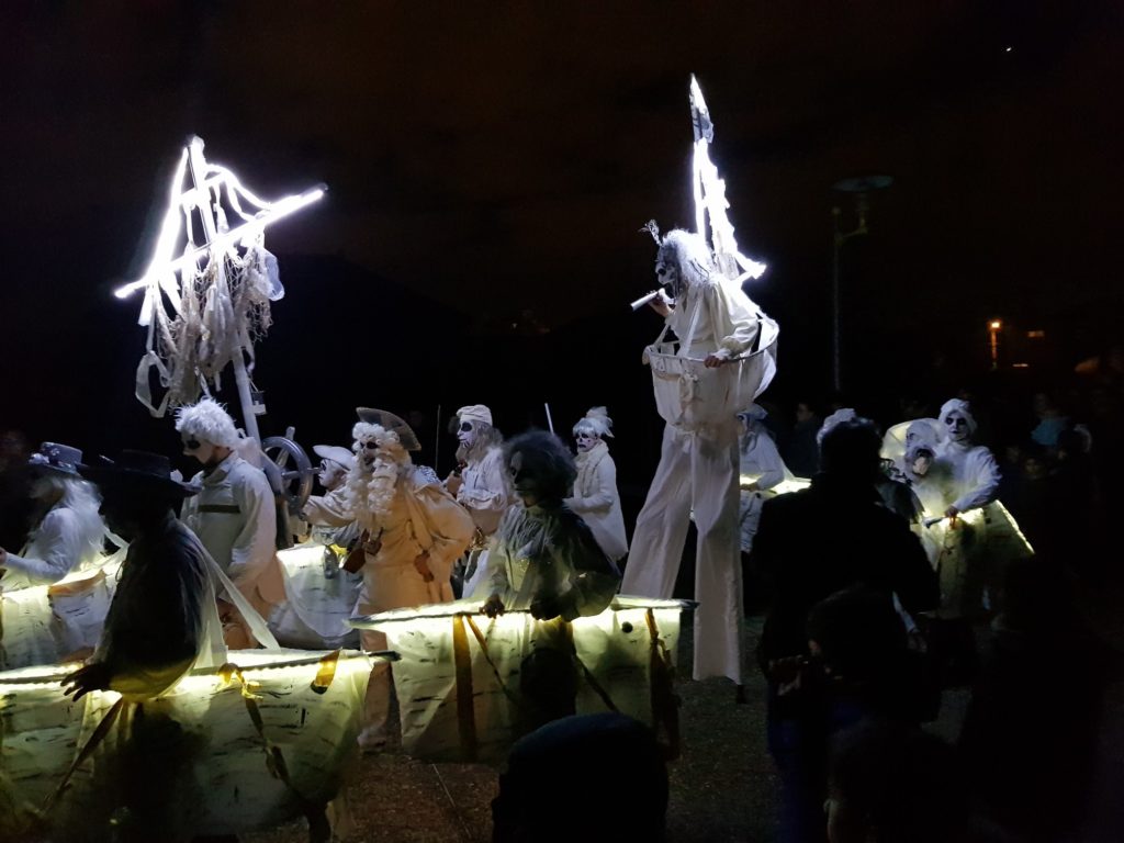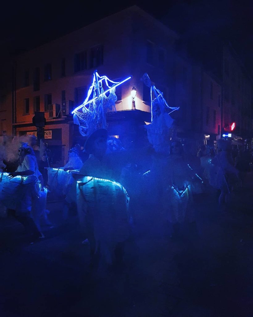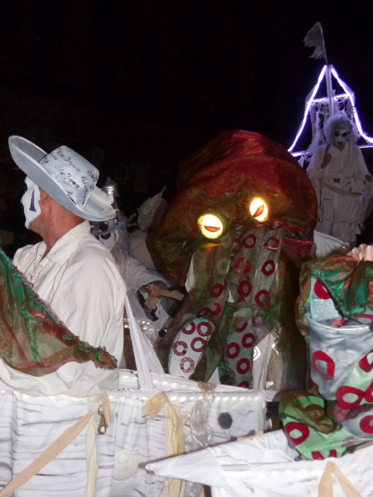 Ils parcourent ainsi la ville et de rue en rue demandent l’aide du public pour affronter tempêtes et monstres. C’est l’énergie des spectateurs qui maintient cette épave à flot et leurs rires qui les aiguillonnent dans leur quête éternelle.